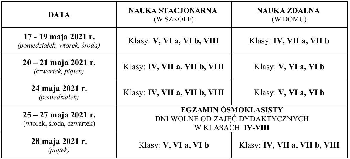 Od dnia 17 maja 2021 r. do 28 maja 2021 r. obowiązywać będzie w klasach IV-VIII nauka w tzw. systemie hybrydowym. Nauczanie będzie odbywać się, z zachowaniem zasad bezpieczeństwa, zgodnie z obowiązującym planem lekcji (według poniższego harmonogramu).