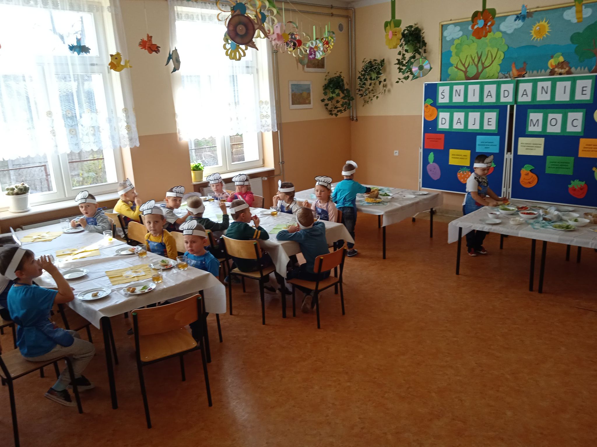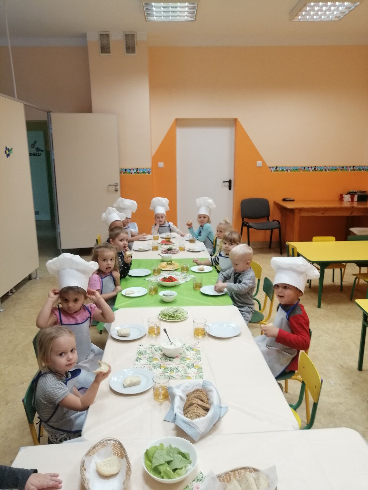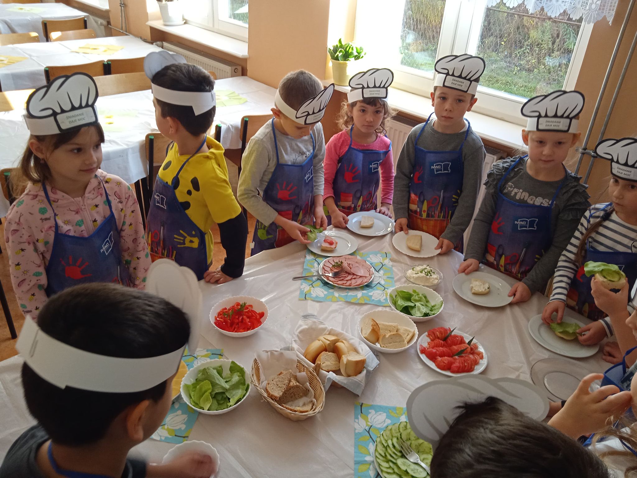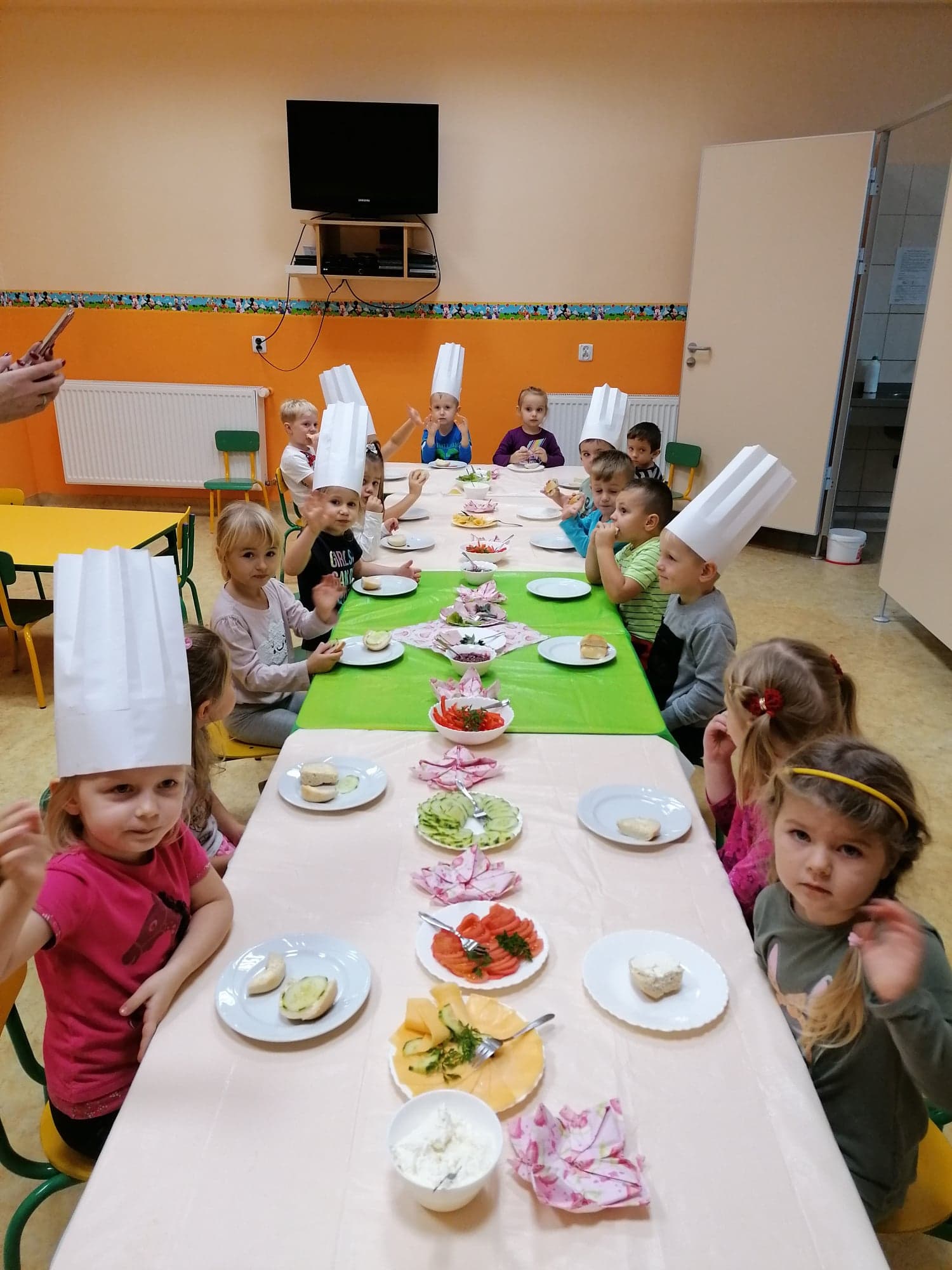 Przedszkolaki z Publicznego Przedszkola w Jeżowem Centrum wiedzą, że warzywa są zdrowe i mają mnóstwo witamin i potrzebnych składników odżywczych. Dlatego tak bardzo chętnie przystąpiły do przygotowania zdrowego śniadania. Dzieci z zapałem układały na swoich kanapkach swoje ulubione produkty: wędlinę, ser, pomidorki, sałatę, ogórki itp. Następnie z wielkim apetytem zjadały swoje kanapeczki,chętnych na dokładki nie brakowało.