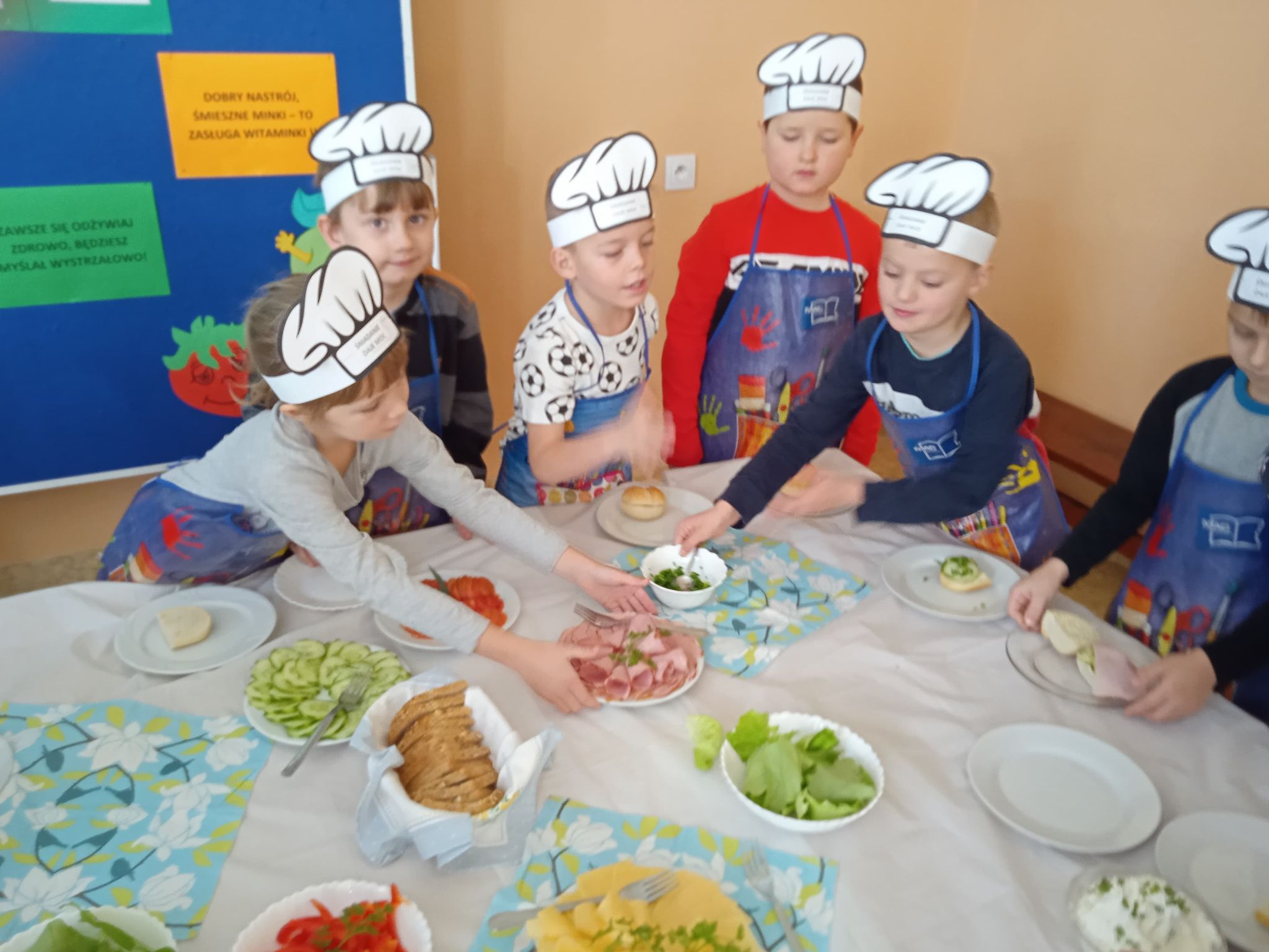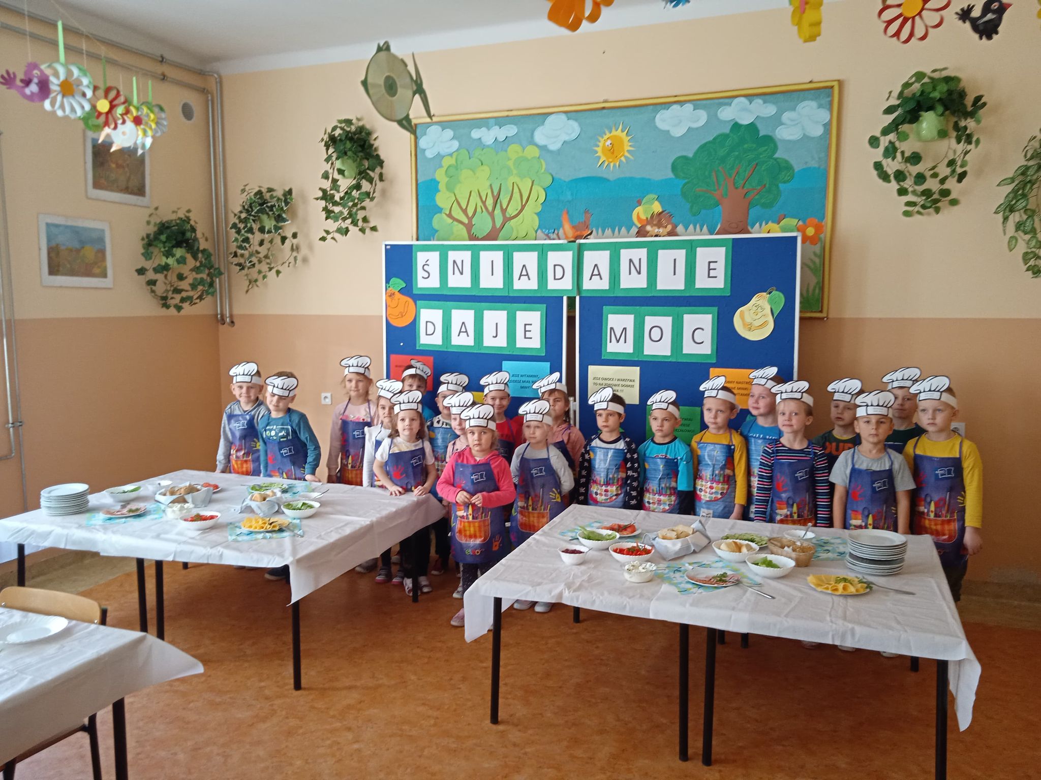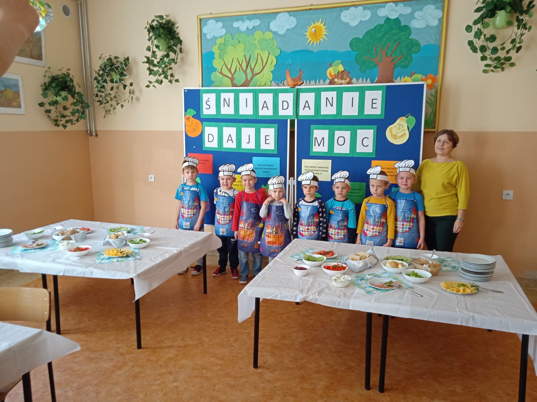 Przedszkolaki z Publicznego Przedszkola w Jeżowem Centrum wiedzą, że warzywa są zdrowe i mają mnóstwo witamin i potrzebnych składników odżywczych. Dlatego tak bardzo chętnie przystąpiły do przygotowania zdrowego śniadania. Dzieci z zapałem układały na swoich kanapkach swoje ulubione produkty: wędlinę, ser, pomidorki, sałatę, ogórki itp. Następnie z wielkim apetytem zjadały swoje kanapeczki,chętnych na dokładki nie brakowało.