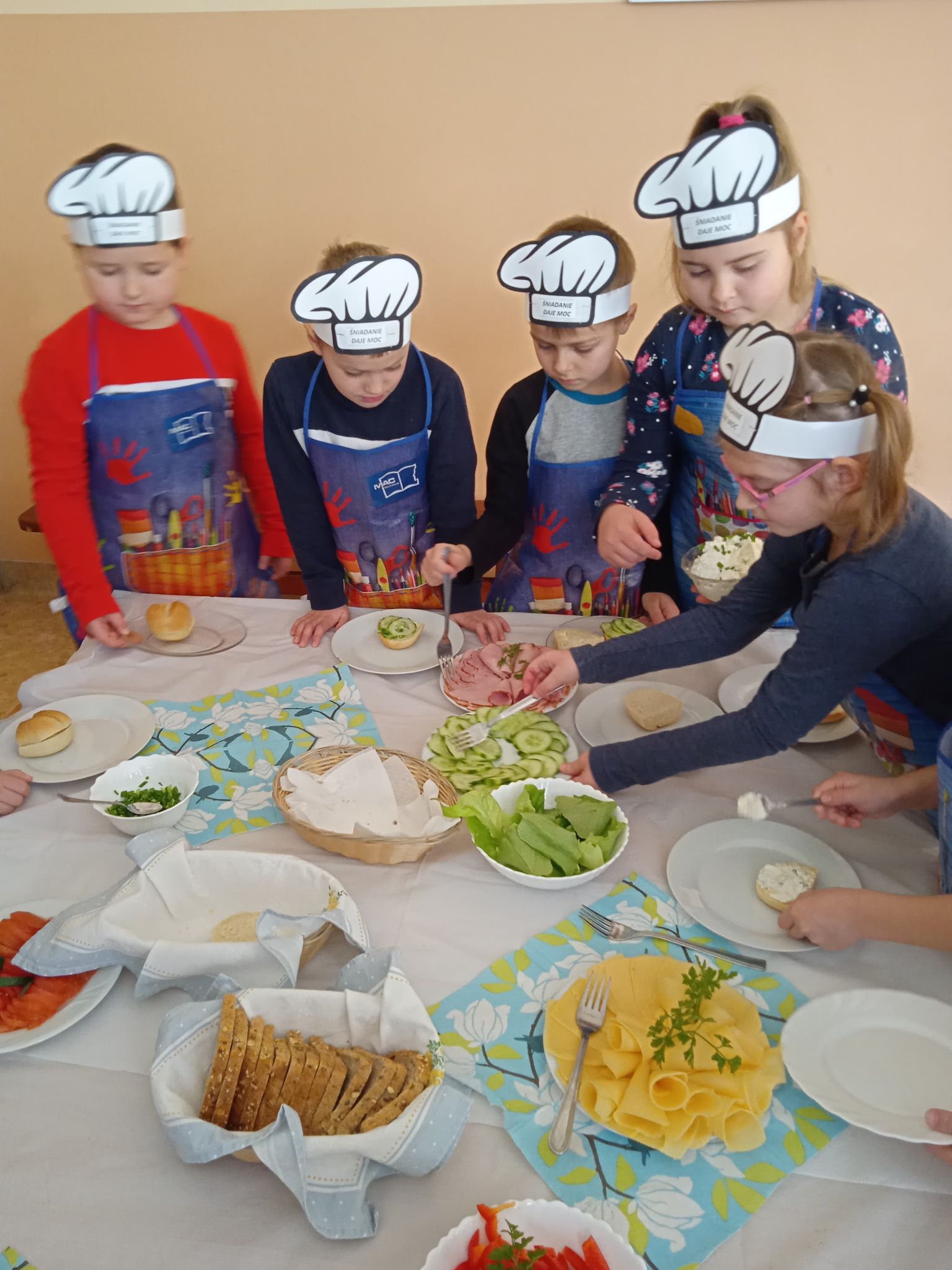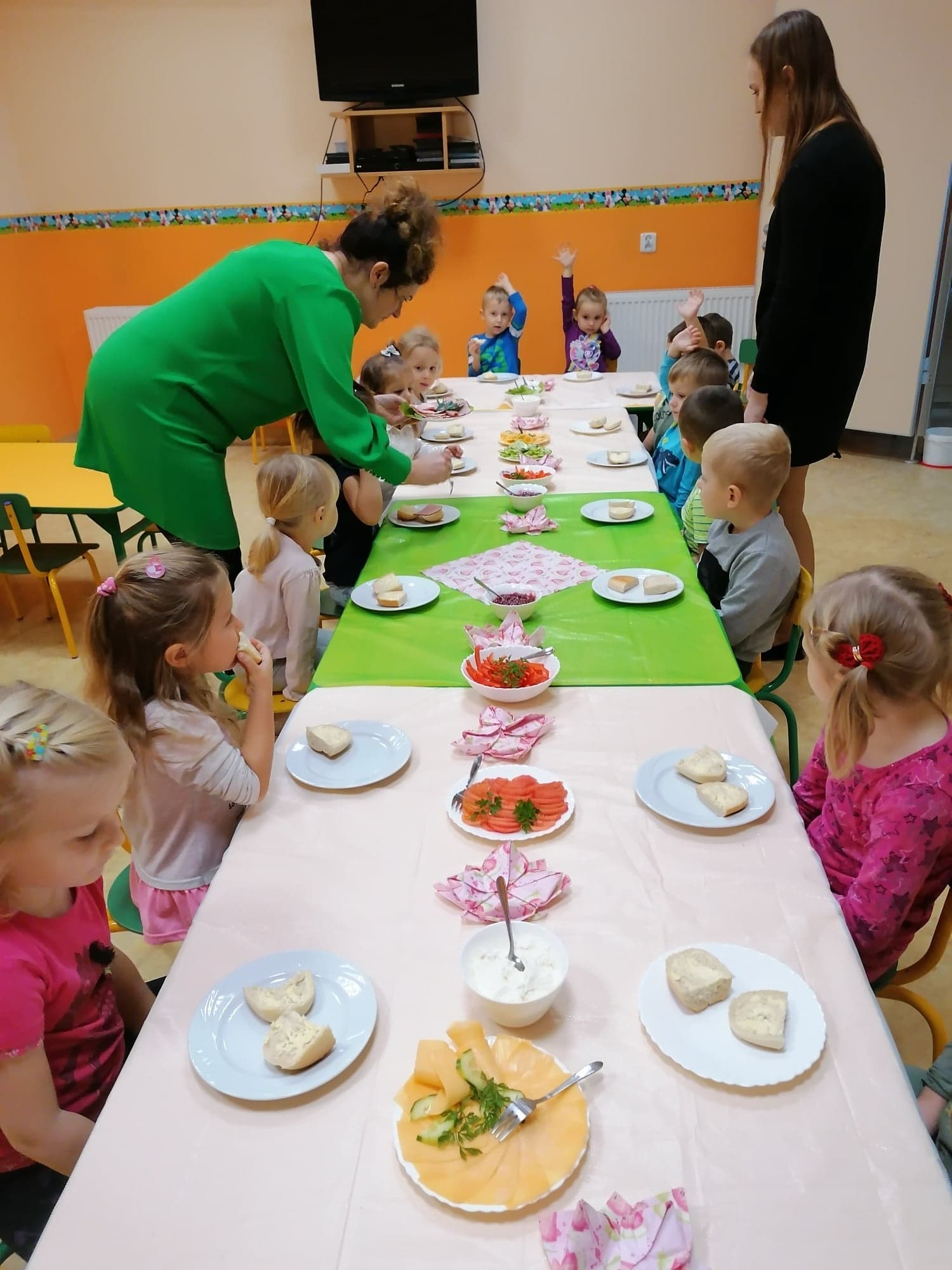 Samodzielny wybór produktów ze szwedzkiego stołu oraz przygotowanie z nich śniadania dostarczyło dzieciom dużo radości i okazji do uczenia się samodzielności.