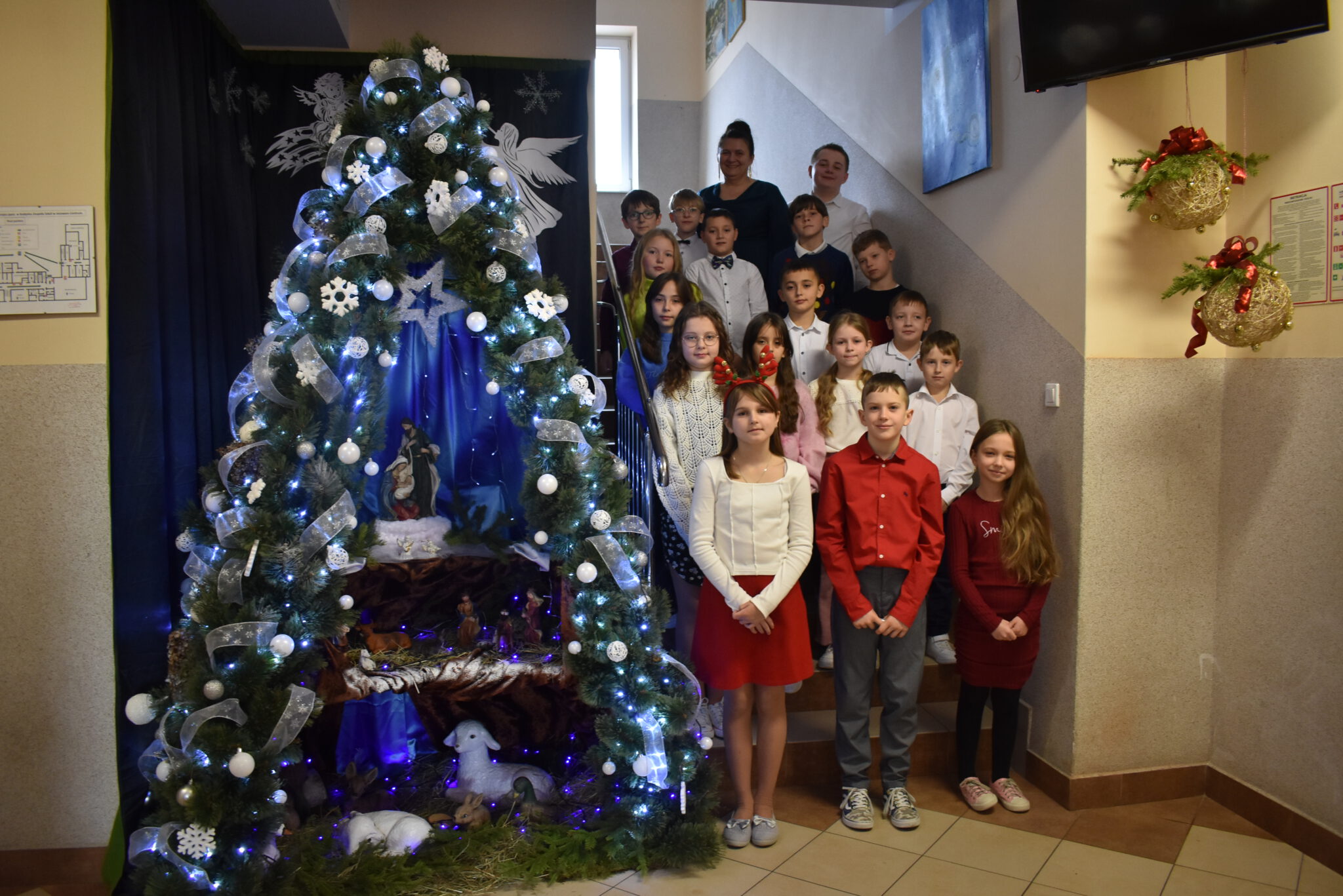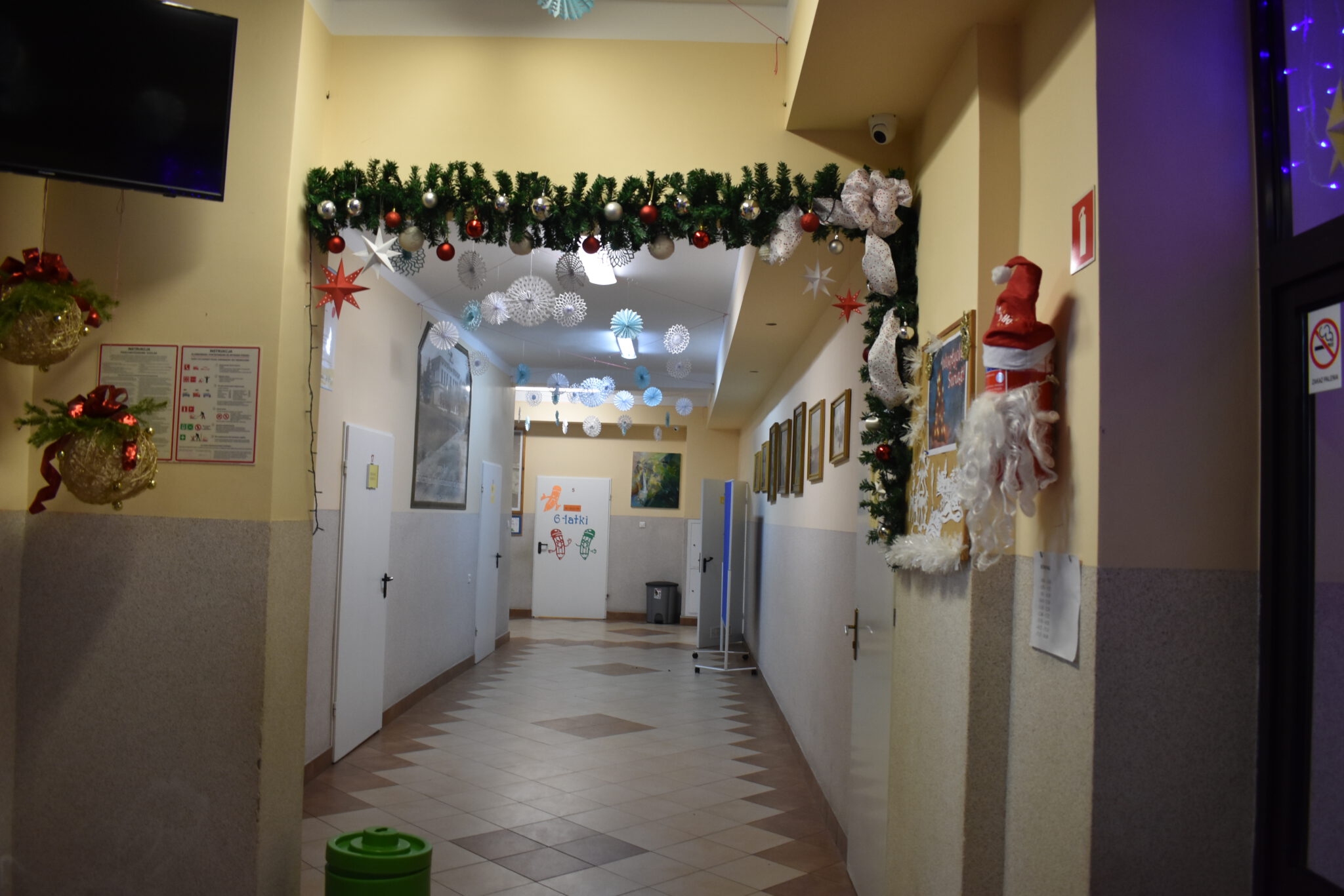 Przepiękną dekorację świąteczną w holu szkolnym wykonali Pani Monika Ziober- sekretarz szkoły, Pani Agnieszka Błądek – woźna i Pan Jan Wojtanowicz – konserwator.