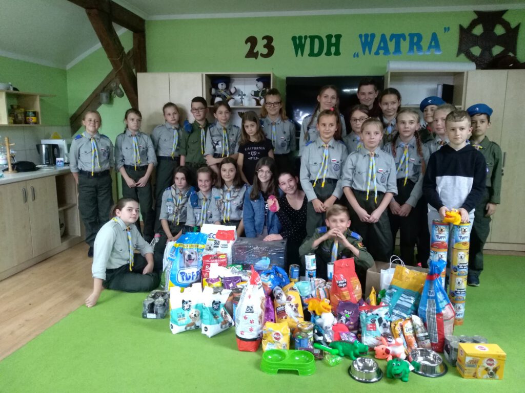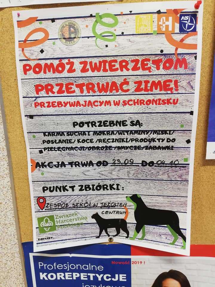 Od 23 września do 4 października 2019 r. harcerze z naszej drużyny harcerskiej prowadzili na terenie szkoły akcję, która miała na celu wspomóc schronisko dla zwierząt. Nie brakowało ciepłych słów i wspaniałych gestów dobroci, czego efektem była ilość zebranych rzeczy. Zgromadzono mnóstwo karmy dla psów i kotów, smycze, miski, zabawki, kocyki, a nawet klatkę dla chomika.