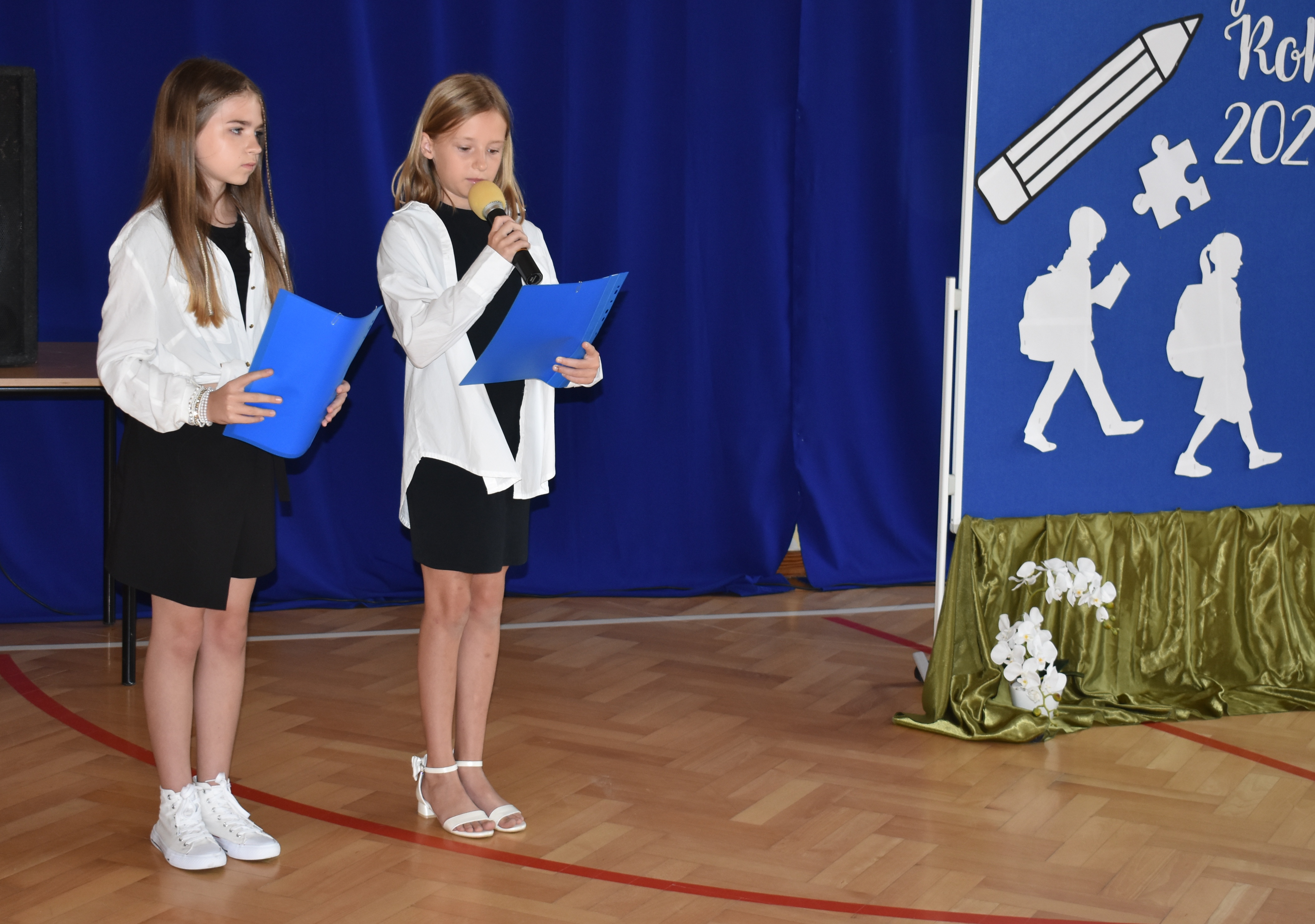 Następnie przybyliśmy na salę gimnastyczną, aby wysłuchać krótką część artystyczną przygotowaną przez Panie: Bogumiłę Pikor i Agnieszkę Wieczerzak. Wysłuchaliśmy również ogłoszeń od Pani dyrektor, po których spotkaliśmy się z wychowawcami klas.