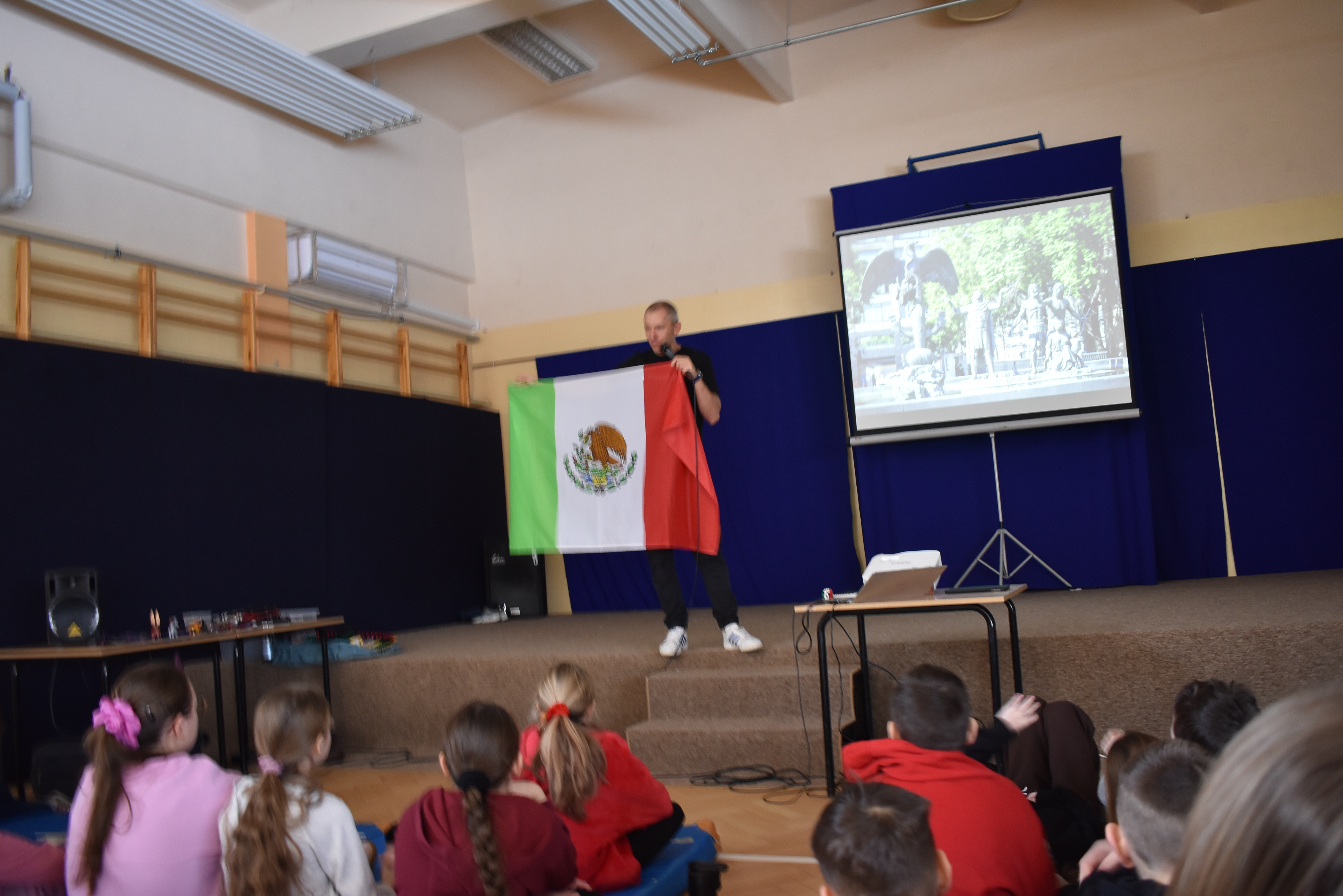 Podziwialiśmy ciekawe stroje i wyroby, jak sombrero, nóż z obsydianu – kamienia wulkanicznego, który przez wieki był wykorzystywany przez rdzennych mieszkańców Meksyku jako narzędzie i ozdoba. Uczniowie poznali zespół „mariachi” z tradycyjną meksykańską muzyką oraz zobaczyli ich charakterystyczne stroje. Pod koniec spotkania oglądaliśmy Półwysep Jukatan.