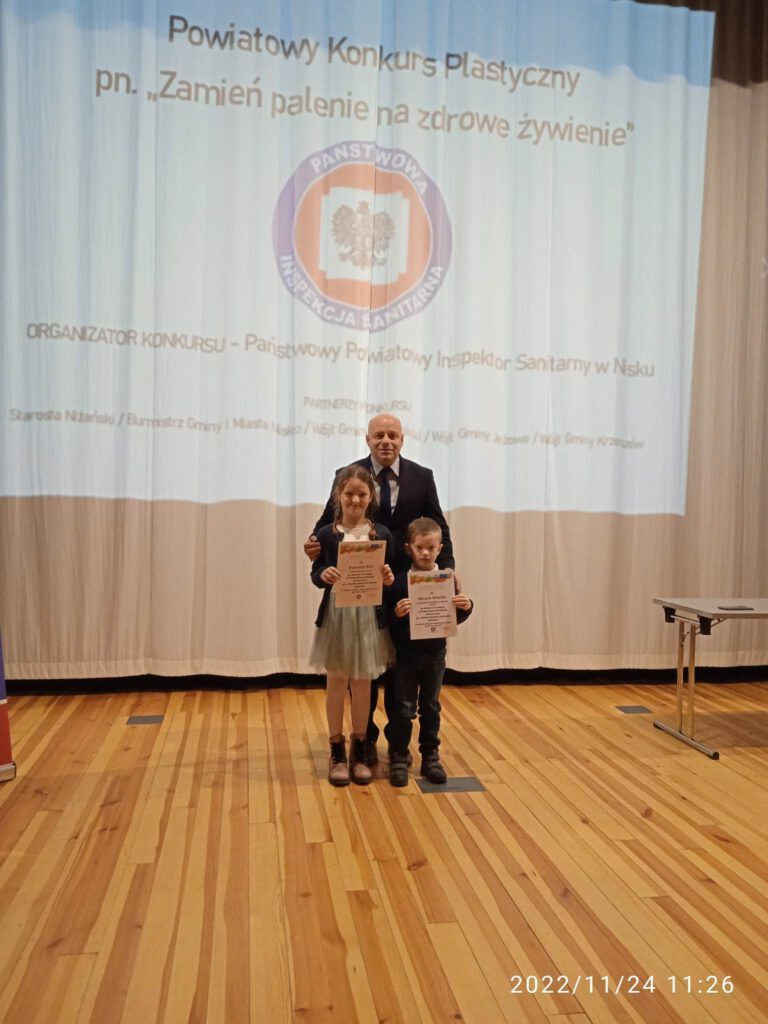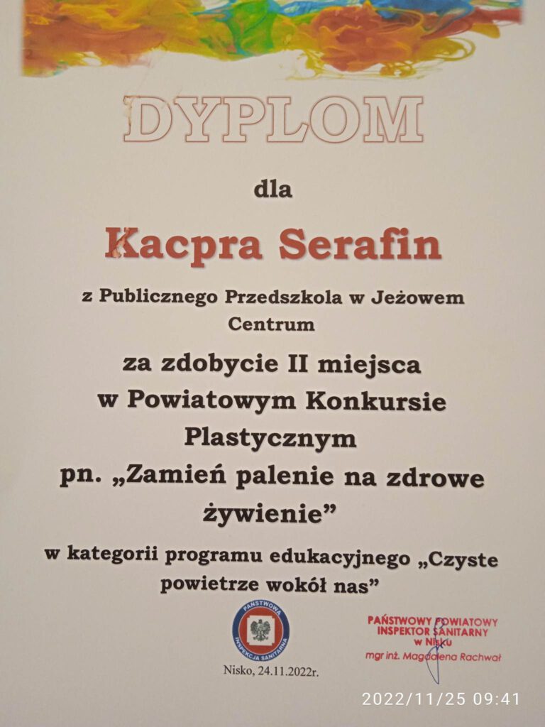 W kategorii programu edukacyjnego „Czyste powietrze wokół nas„ Kacper Serafin z Publicznego Przedszkola zajął II miejsce, natomiast Zuzanna Dul z kl. I a zajęła III miejsce w kategorii programu edukacyjnego „ Nie pal przy mnie, proszę”.