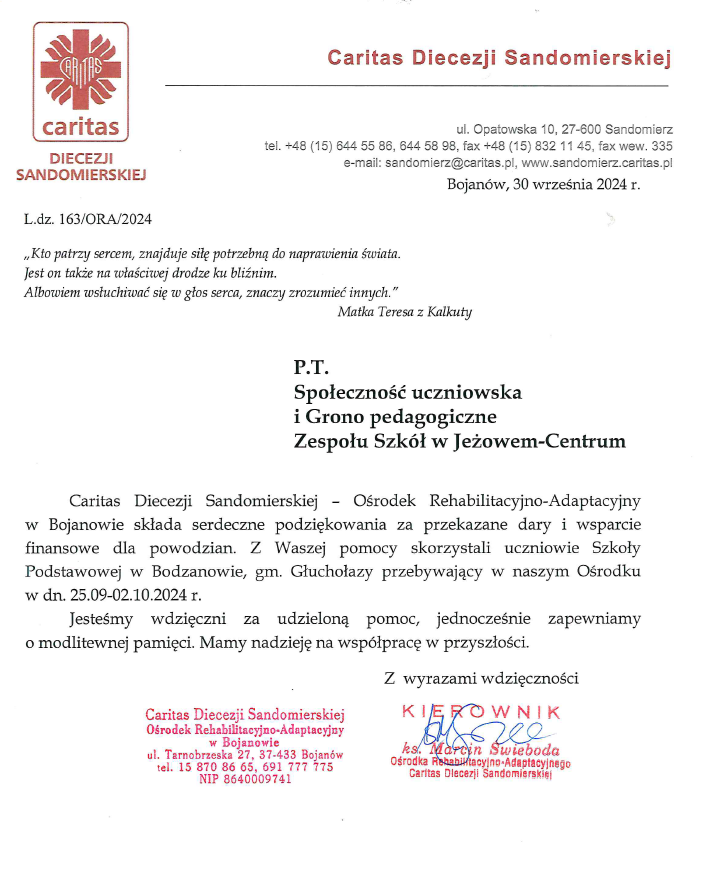 Bardzo serdecznie dziękujemy całej społeczności szkolnej: dzieciom, rodzicom, nauczycielom, pracownikom szkoły, członkom Szkolnego Koła Caritas i naszej Drużynie Harcerskiej za włączenie się w Akcję Pomocy dla Powodzian.